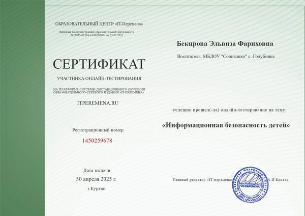 В 2022 году я получила квалификацию воспитателя, а с 2023 года работаю в ДО МБОУ «Голубинская СОШ им. Бессонова И. Г.».